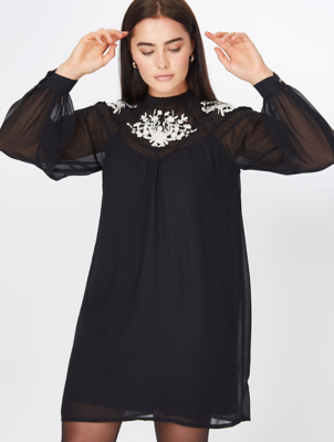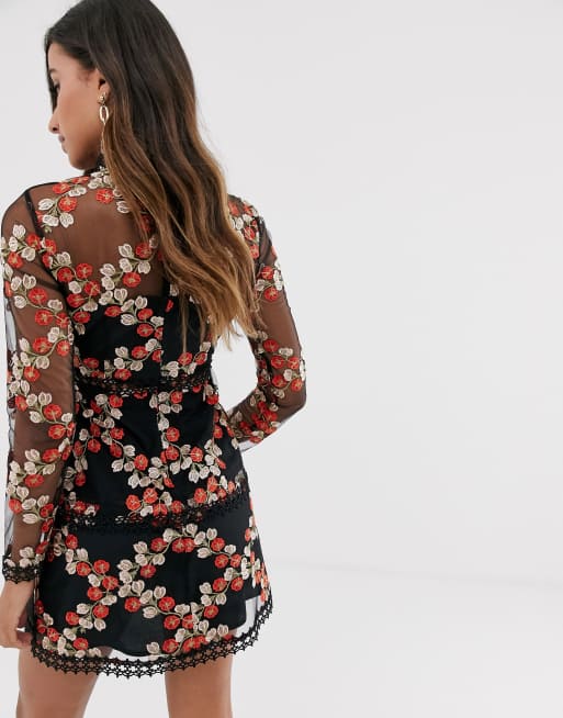 Black Embroidered Floral Mini Dress